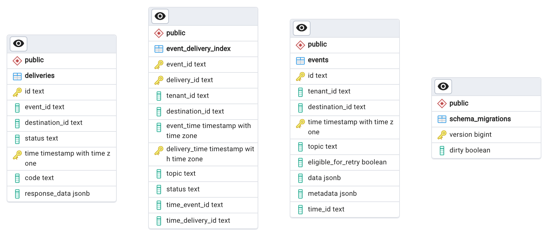The following diagram shows the Outpost schema. You can connect to the database instance within your Outpost installation to inspect the schema further.